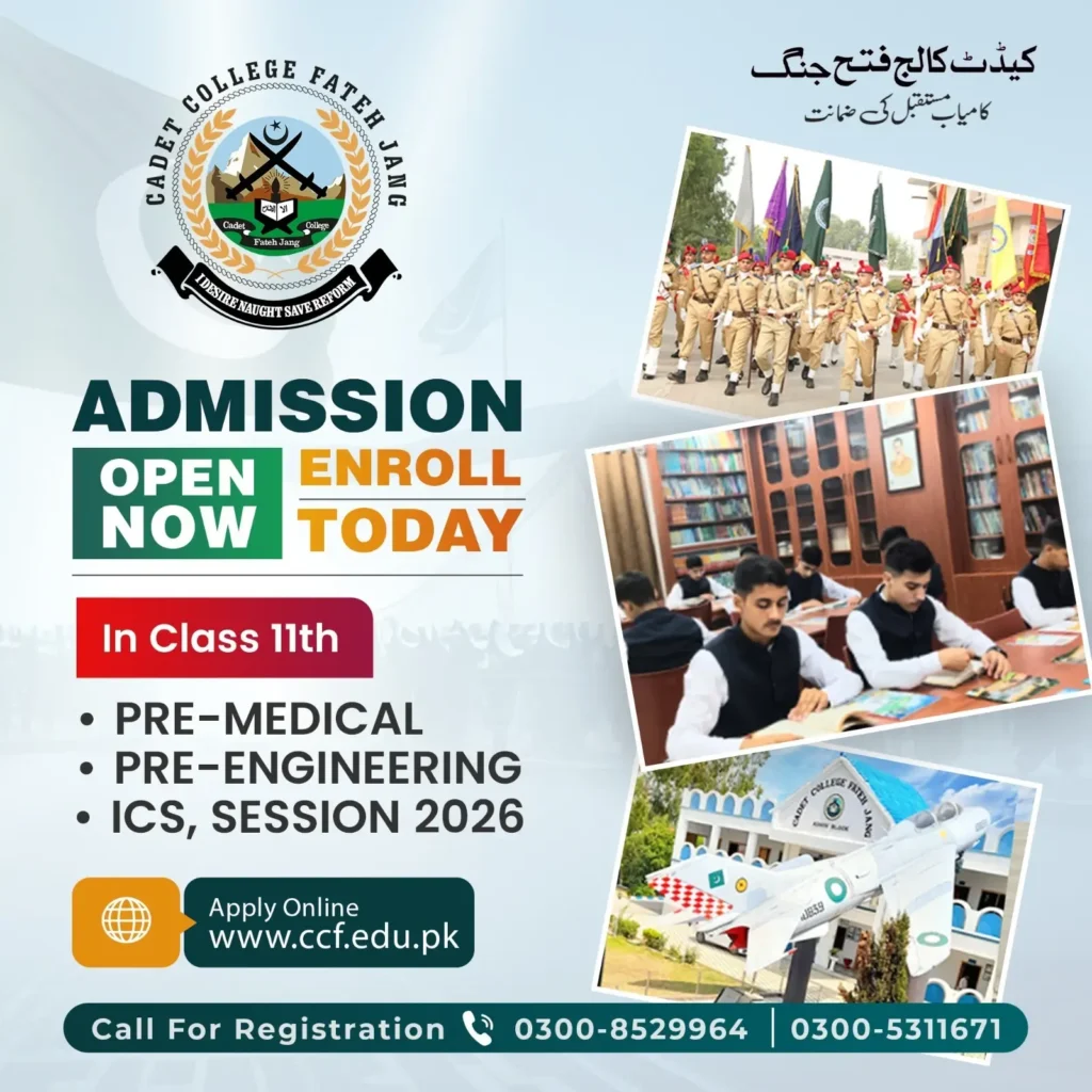 Pakistan’s Leading Cadet College: Cadet College Fateh Jang is now accepting applications for the 11th class (Pre-Medical, Pre-Engineering, and Computer Science) Session 2026-27 academic year. Aspiring students from across Pakistan are invited to apply to our esteemed programs.