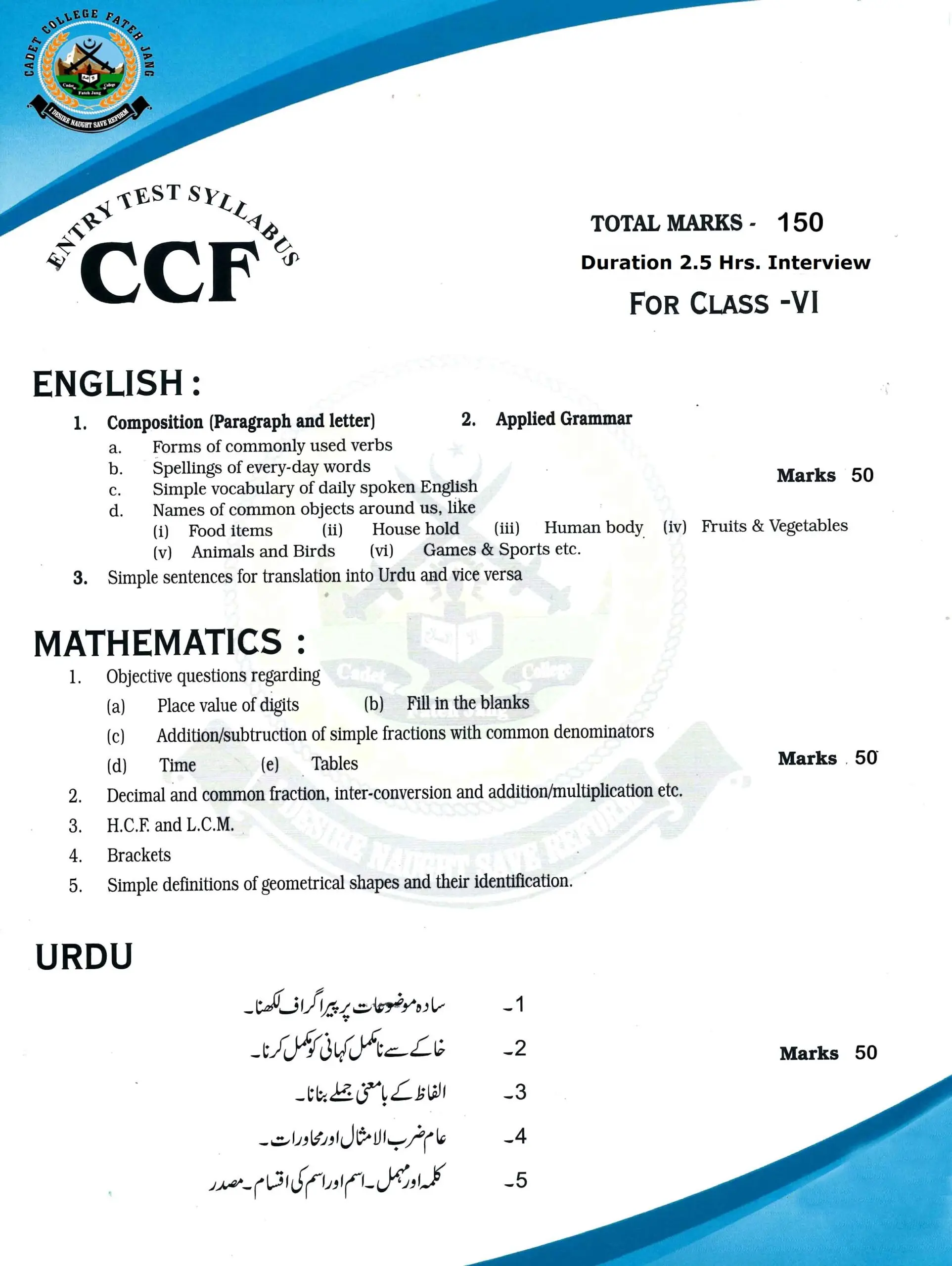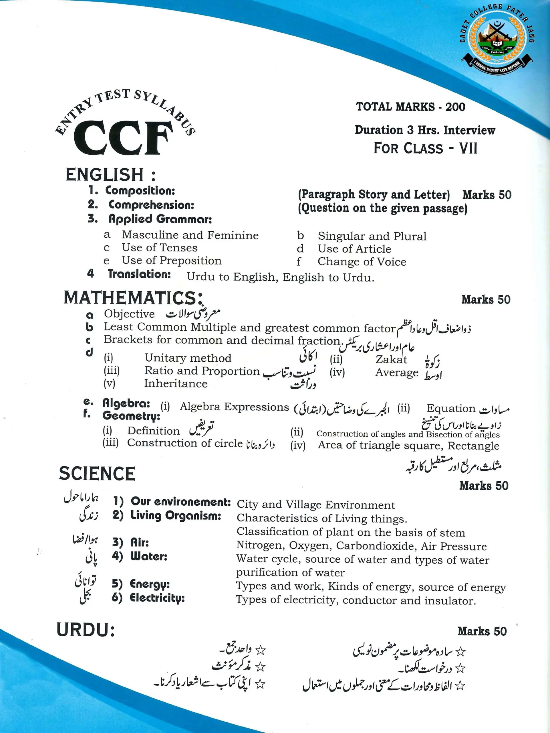 Exact date, time and place of examination will be communicated in writing to the candidates. Examination will be held at the following centres. RAWALPINDI, ISLAMABAD, LAHORE, CADET COLLEGE FATEH JANG, MULTAN, PESHAWAR, KARACHI